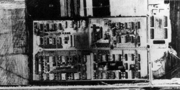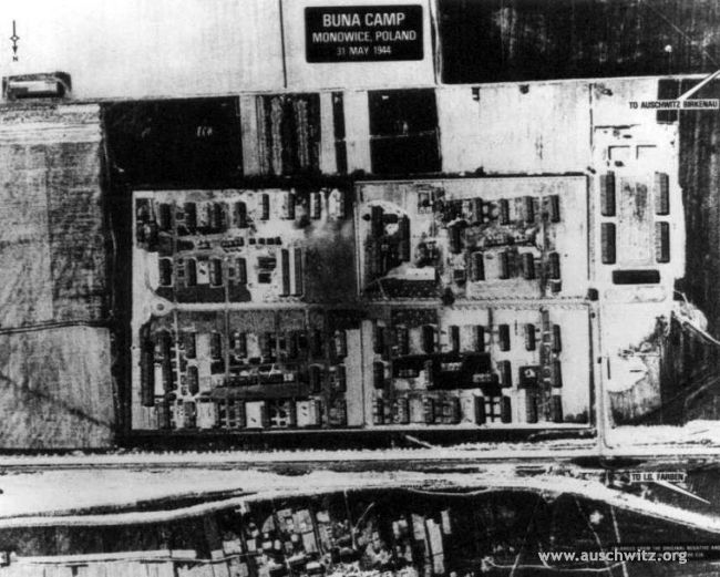 Luftaufklärungsfoto der Alliierten, 31. Mai 1944. Ein Panorama der Buna-Werke, die zur IG Farben gehörten. Aufnahme aus dem Jahr 1945 Das Bild wurde während des Besuchs von Heinrich Himmler im IG-Farben-Werk im Jahr 1942 aufgenommen Das Foto wurde während des…