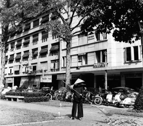 Có lẽ là nếu không có hình bóng tà áo dài và nón lá, thì hình ảnh này không khác gì ở phương Tây. Tòa nhà màu trắng là REX Hotel nổi tiếng ở đại lộ Nguyễn Huệ. Từ thập niên 1920, nơi này dã là khu phức hợp thương mại, trưng bày ô tô của hãng Citroën và một số hãng khác.