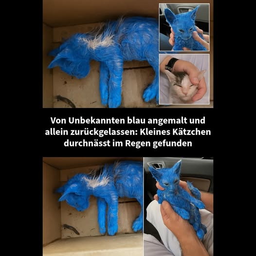 „Dieses arme kleine Kätzchen wurde durchnässt im Regen gefunden. Wir haben keine Worte, um unsere Wut auszudrücken! Was treibt einen Menschen dazu, so etwas zu tun? Man hatte sie einfach blau angemalt.“
